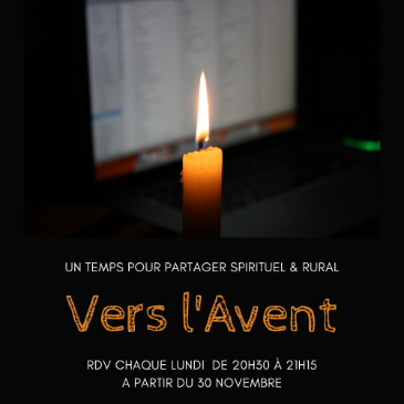 Retrouvons-nous chaque lundi de l'Avent, de 20h30 à 21h15 pour partager un texte d'Évangile et écouter sa résonance pour nous dans cette période.