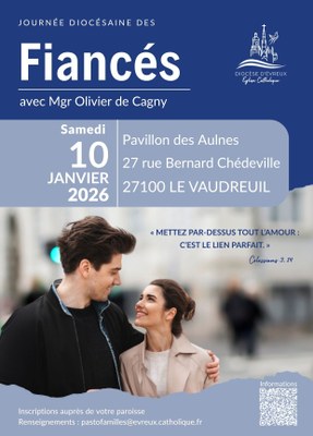 Le service de la pastorale des familles avec les équipes de préparation au mariage invite les fiancés et jeunes mariés à un temps fort autour du sacrement de mariage. Cette journée festive, en présence de Mgr Olivier de Cagny, s'intègre aux préparations au mariage paroissiales. Elle les complète et les enrichit en offrant aux couples de fiancés l'occasion de se rencontrer, d'échanger entre eux et avec des couples mariés, de grandir dans leur vocation grâce à des enseignements et à des témoignages et de rendre grâce ensemble.