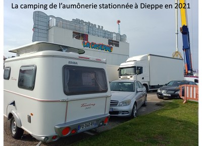 C’est assez exceptionnel pour être souligné: le curé des forains a une petite caravane qui permet de rester sur les foires ou les cirques pour vivre quelques jours avec les artisans de la fête. C’est important pour nous d’être comme Jésus le bon berger qui vit au milieu de ses brebis. La petite caravane a été placée en 2020 sous la protection de sainte Thérèse de l’enfant Jésus (Thérèse de Lisieux), avec cette devise: " aimer Jésus